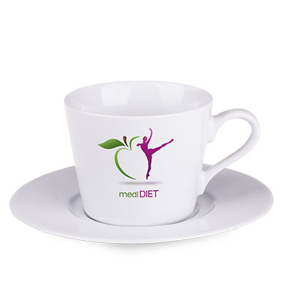 Porcelanowa filiżanka reklamowa o stożkowych ściankach i uchwycie w kształcie połówki serca. Stożkowe ścianki umożliwiają naniesienie rozbudowanego nadruku reklamowego.