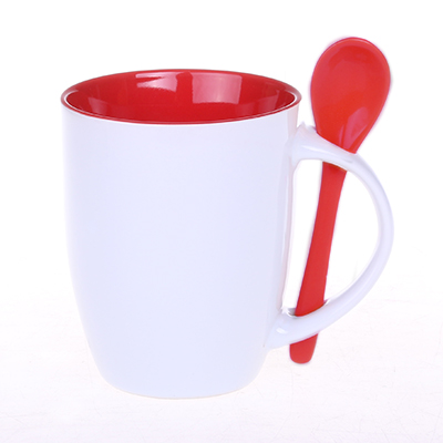 Kubek reklamowy z kolorowym wnętrzem i białym szkliwem na zewnątrz. W zestawie ceramiczna łyżeczka. Unikatowy kształt uchwytu ułatwia przechowywanie łyżeczki. Produkt jest końcówką serii, mogą na nim występować nakłucia, kropki oraz różnice w odcieniu szkliwa.