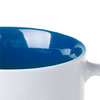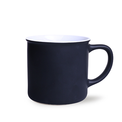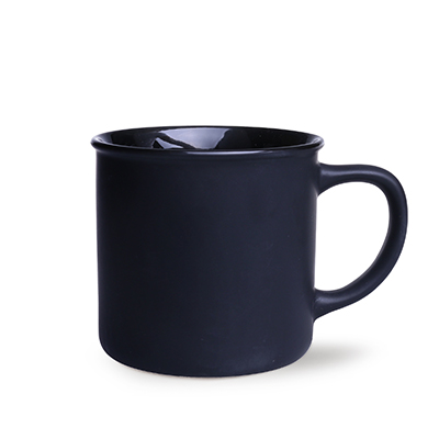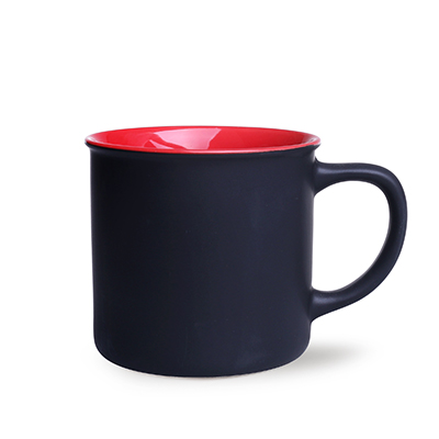 Mały z wyglądu, lecz o dużej pojemności kubek ceramiczny o czarnej, matowej powierzchni zewnątrz i kolorowym środku.