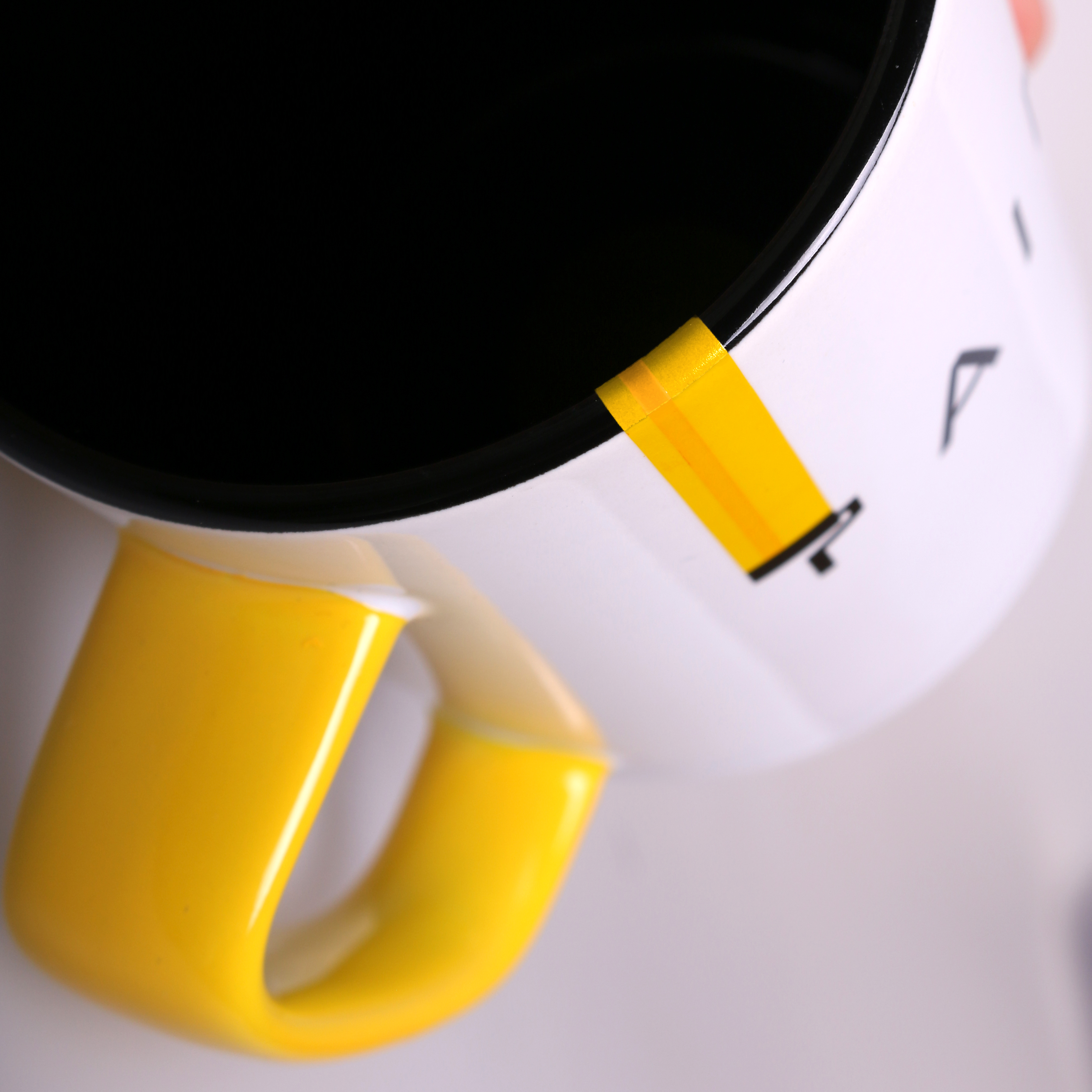 Kubek Tommy to ceramiczny kubek o charakterystycznym, oryginalnym kształcie ucha, kolorowym środku i białej strukturze z zewnątrz.